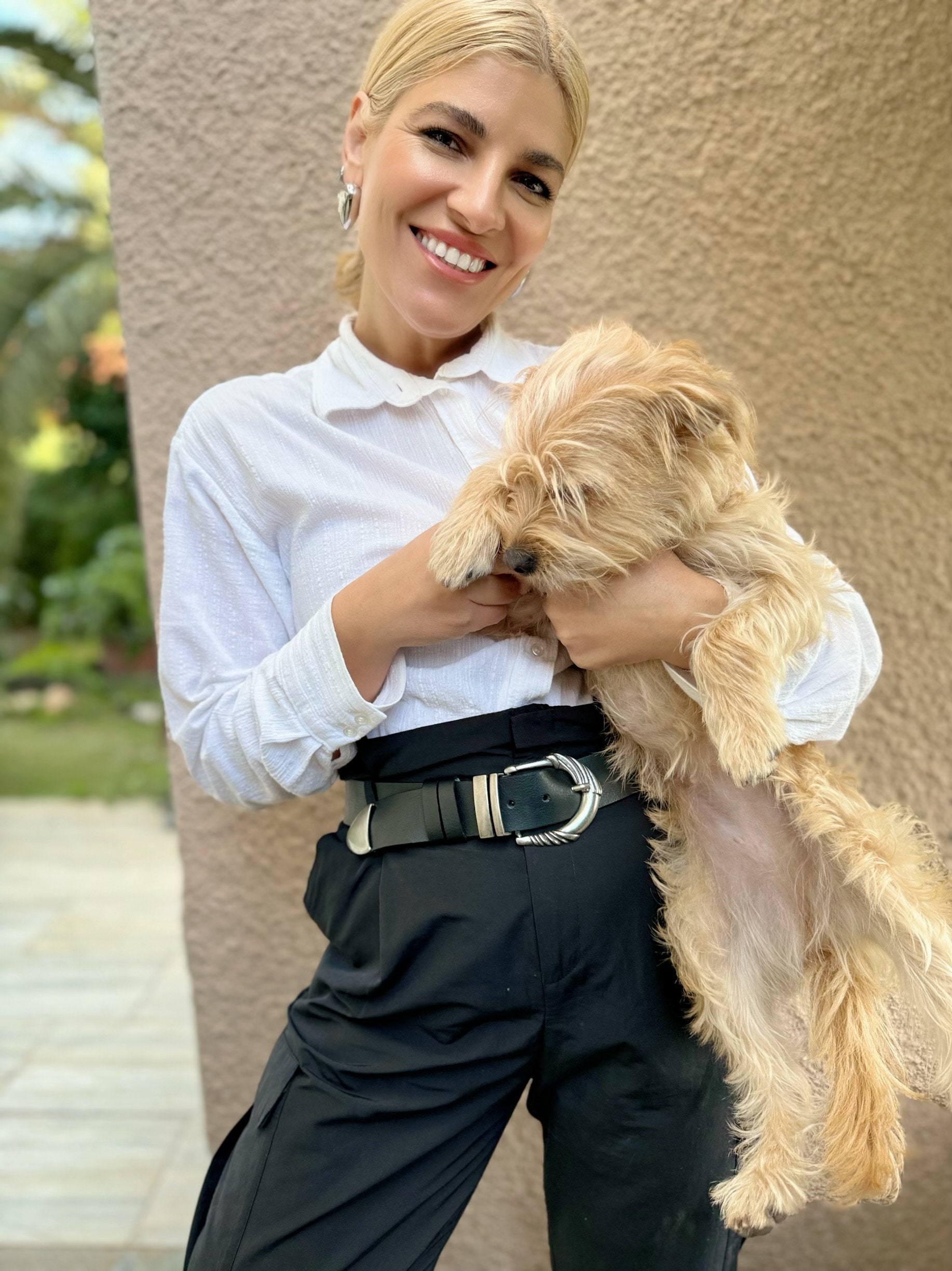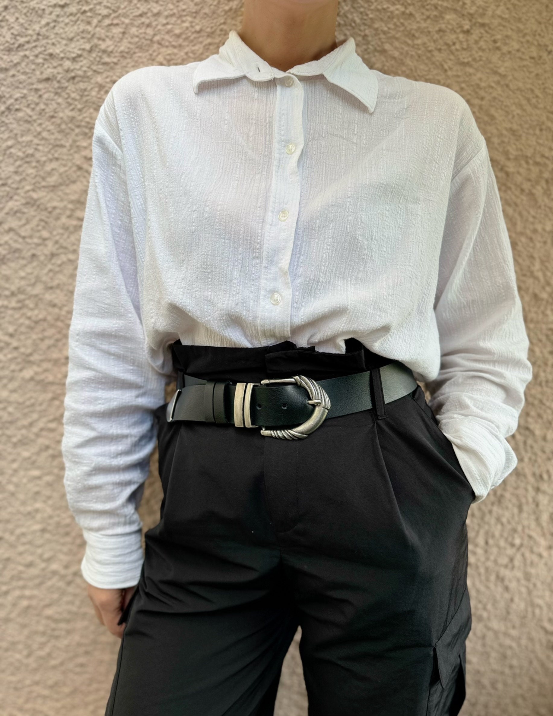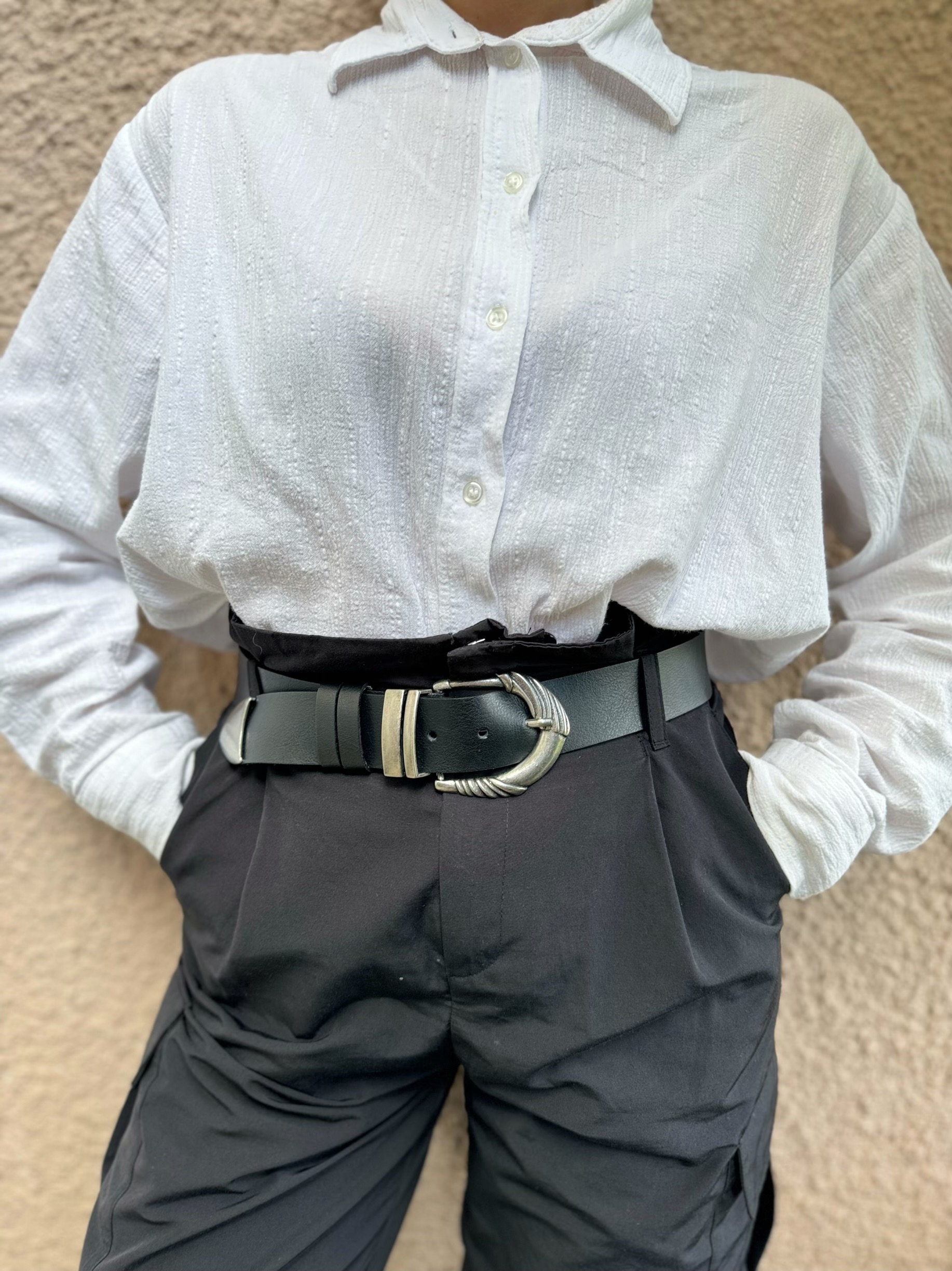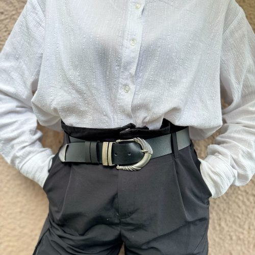 Introducing the Black Leather Belt: a meticulously crafted accessory exuding elegance and versatility. Made with genuine leather, this handcrafted belt showcases a stunning interplay of black and silver. Adorned with a distinctive engraved central buckle, complemented on either side and the belt’s edges, it effortlessly adds a touch of sophistication to any ensemble. Elevate your style and seamlessly pair this timeless piece with any outfit.