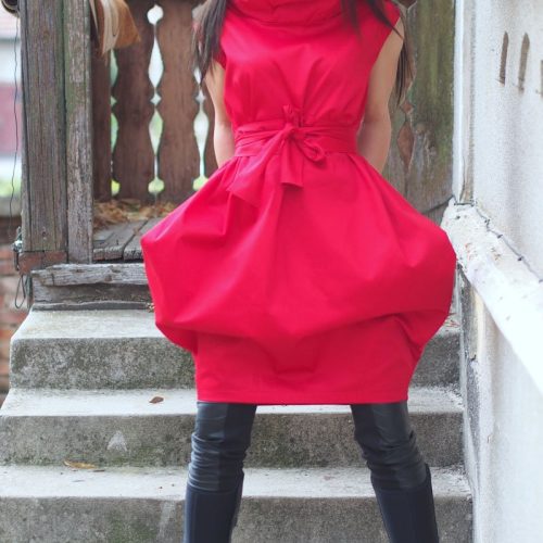 Step into the spotlight with this bold red avant-garde cocoon dress. Designed for women who love expressive and sculptural fashion, this unique midi dress features a dramatic high funnel neck, sleeveless cut, and a voluminous cocoon-shaped skirt. The matching fabric belt allows you to define your waistline for a personalized silhouette. Whether you re headed to an art event, photo shoot, or a stylish evening out this handmade piece will make you unforgettable.