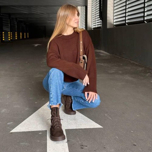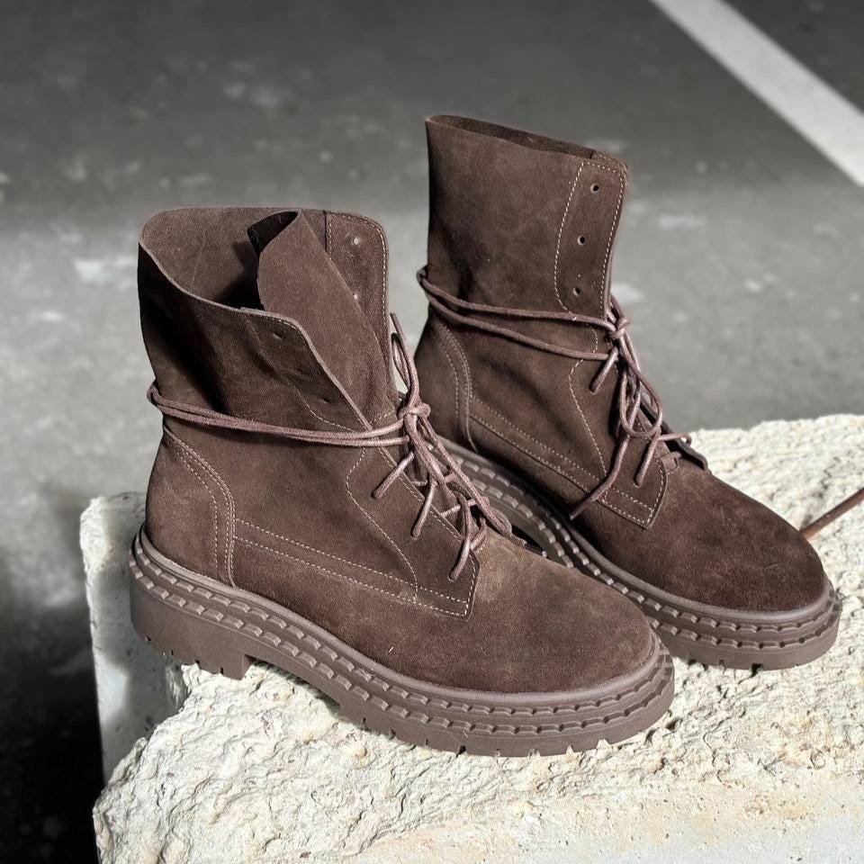 These women s brown suede combat boots combine rugged charm with everyday comfort. Designed with a lace-up front and chunky sole, they provide stability and support for all-day wear. The ankle-high cut and soft fleece lining make them a perfect choice for the autumn season, keeping your feet warm while maintaining breathability.