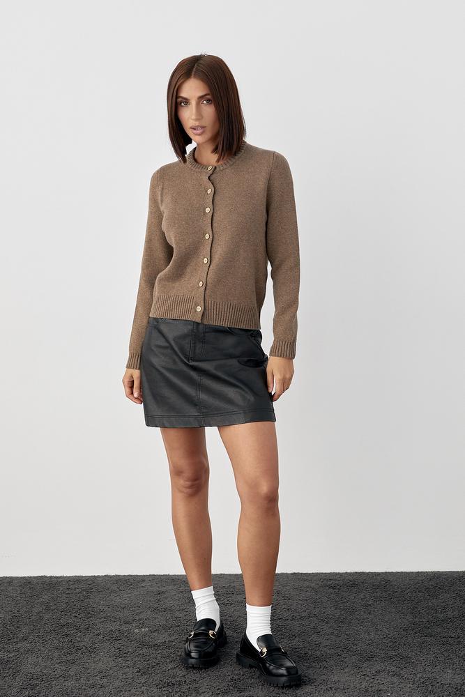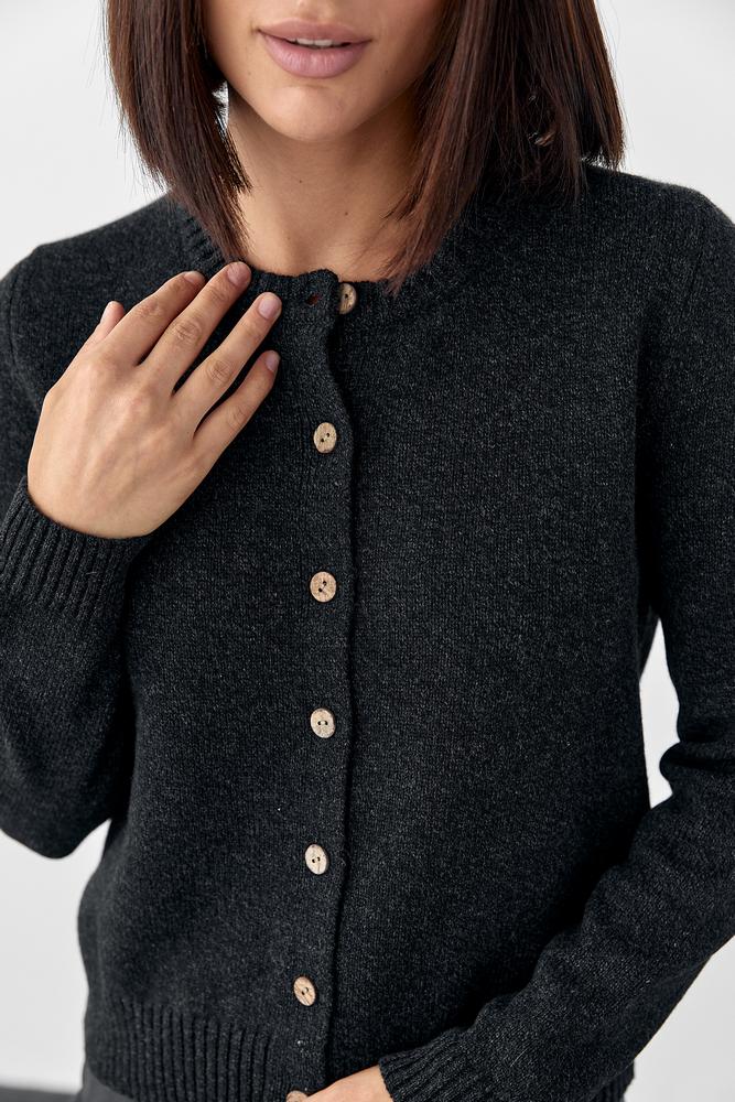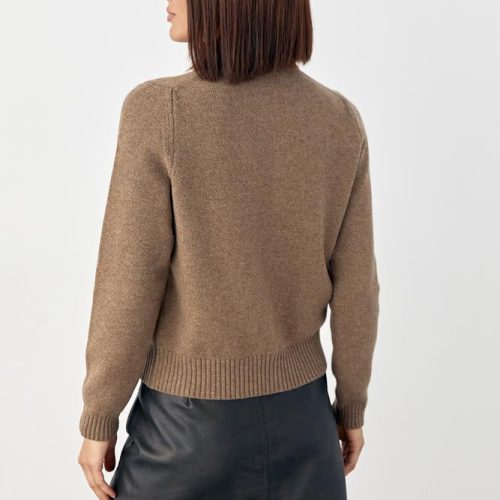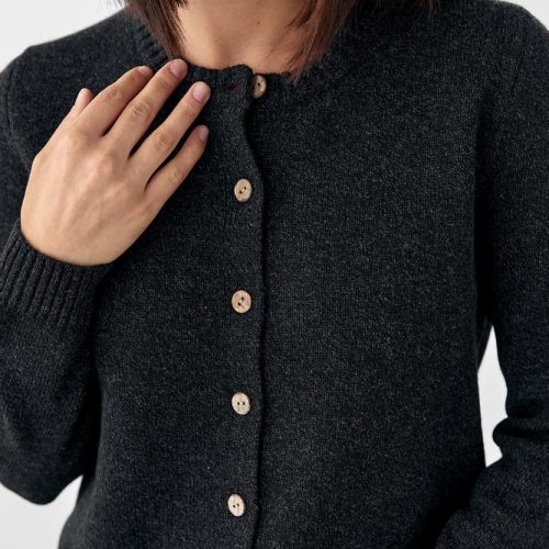 Fine wool texture, lightweight warmth, neat ribbed hems, and natural shell-tone buttons. A versatile essential for fall, winter, and early spring.
