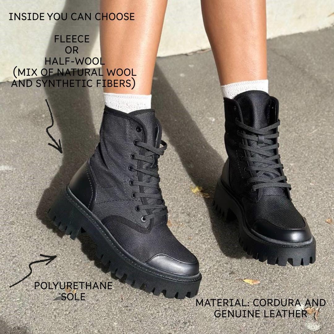 Experience the perfect combination of practicality and style with these women’s black leather boots, designed to be your most reliable pair for daily walking. The upper is constructed from high-quality genuine leather paired with robust Cordura fabric, which not only adds a modern casual military look but also offers excellent resistance to moisture and wear. This makes them an ideal choice for unpredictable autumn weather and slushy winter streets.